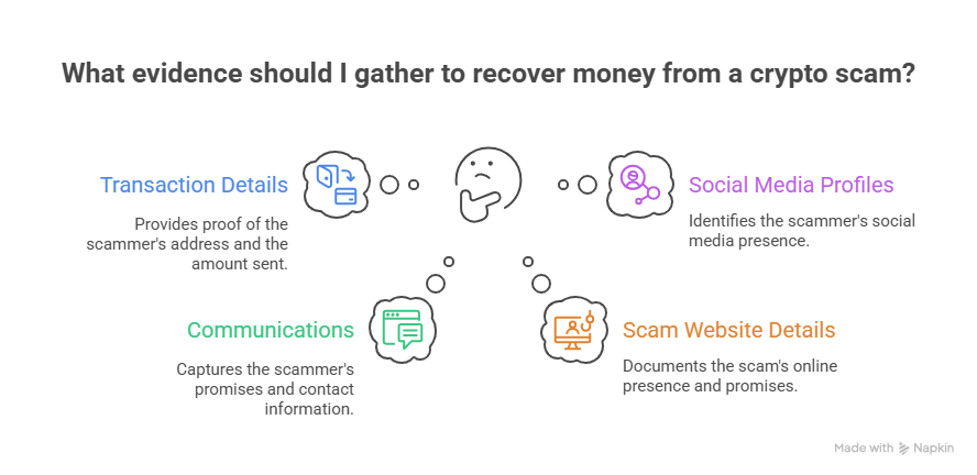 You need to build a case. Think like a detective. Your evidence is crucial for any chance to recover money from crypto scams. Collect and save: