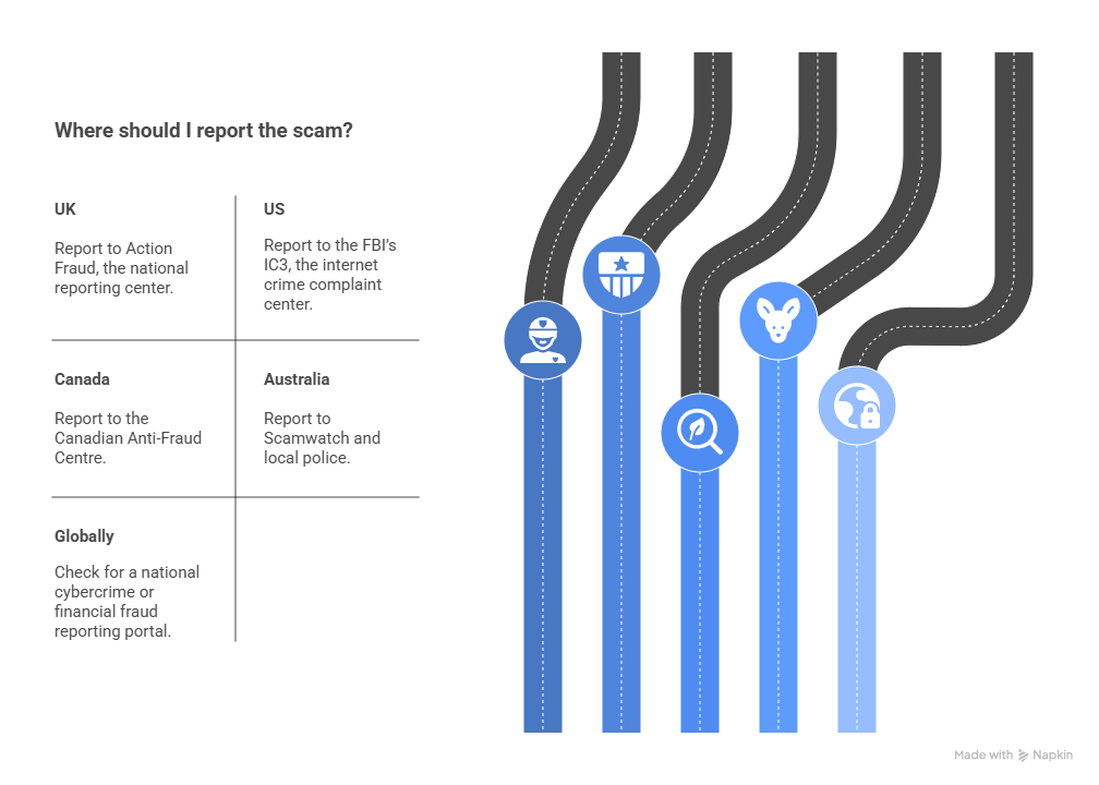 • Globally, check for a national cybercrime or financial fraud reporting portal.